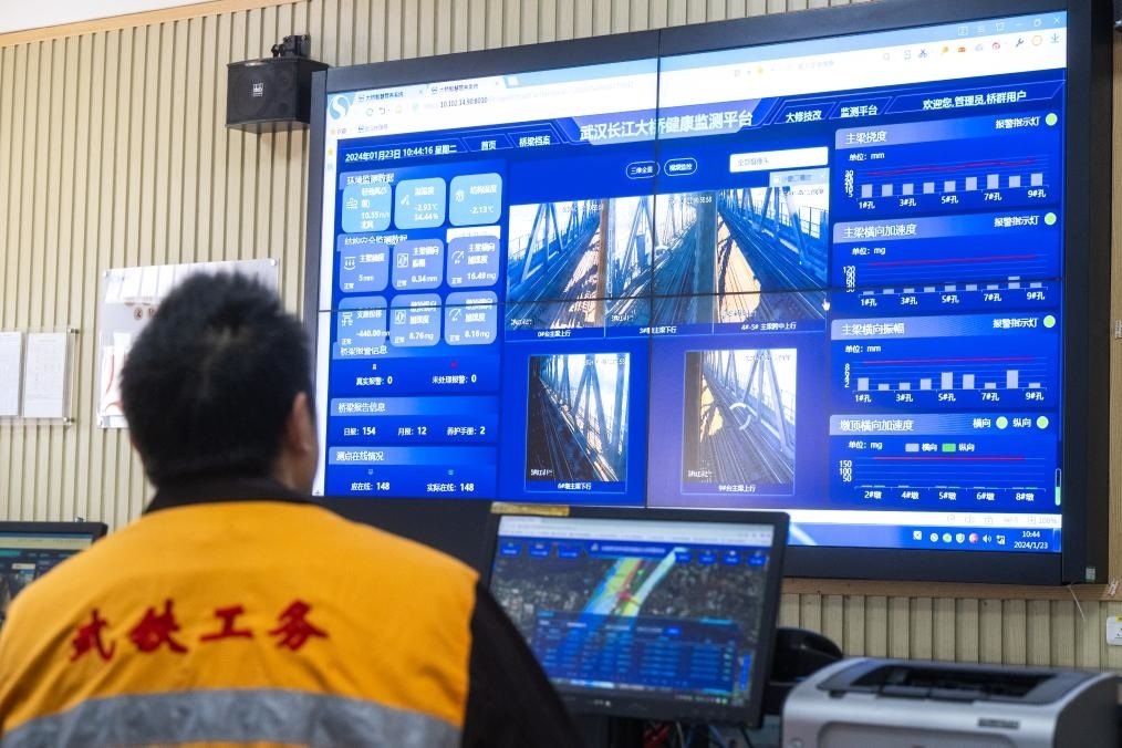 進入高鐵時代,隨著技術(shù)的發(fā)展與進步,大橋養(yǎng)修標(biāo)準(zhǔn)提升,養(yǎng)護水平不斷提高。在武漢長江大橋橋梁車間辦公樓一樓的主控室,大屏上顯示著大橋數(shù)十處關(guān)鍵處所監(jiān)控畫面,大橋上橋梁防撞監(jiān)控系統(tǒng)和橋梁健康監(jiān)測系統(tǒng)的各項數(shù)據(jù)實時更新。