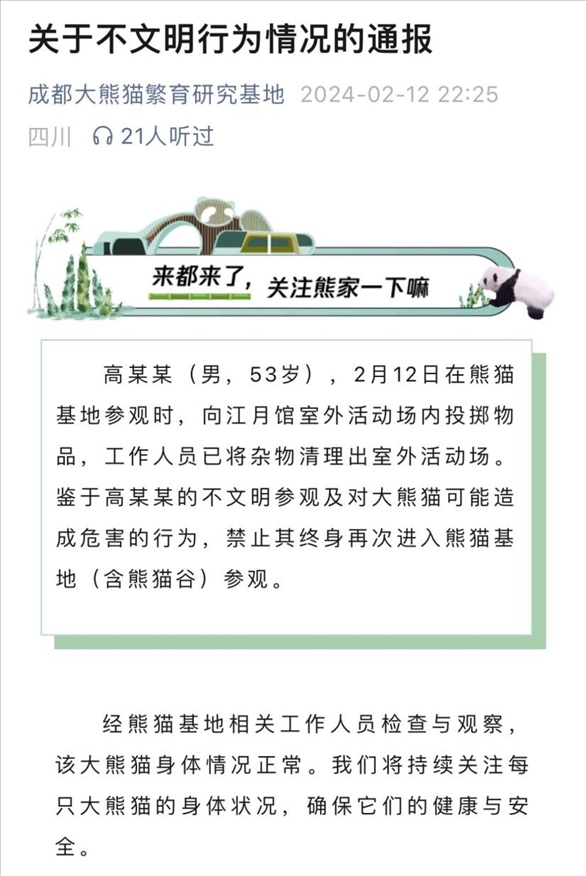 ·一游客在成都大熊貓基地參觀時向場內(nèi)投擲物品,被終身禁入。