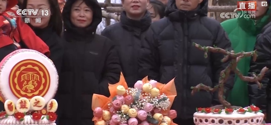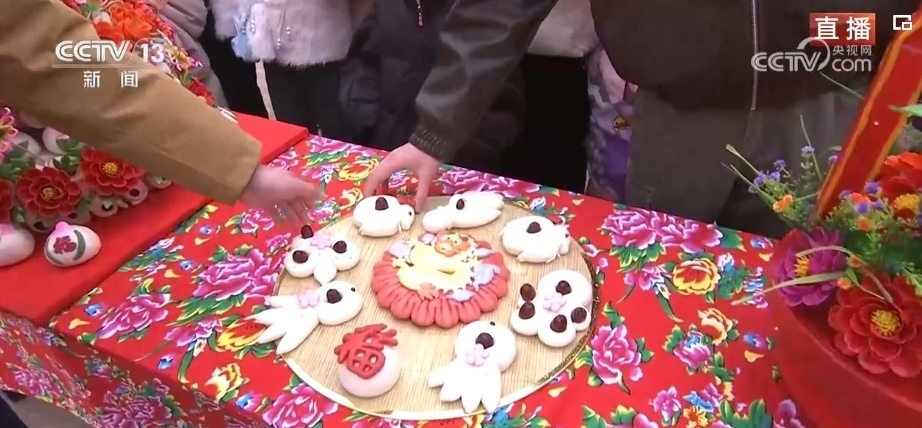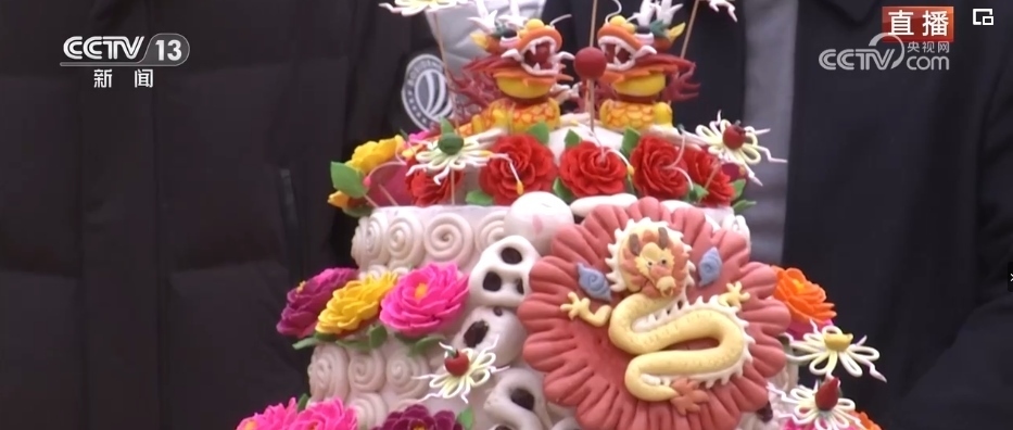 在春節(jié)期間,家家戶戶都會蒸年饃,每個年饃都有不同的寓意,花開富貴、步步高升等,龍年特色的花饃非常熱銷。這個龍型年饃上彩色的元素都是可以食用的,黃色的身子是南瓜汁,藍色是當?shù)匾环N茶葉水調出來的。