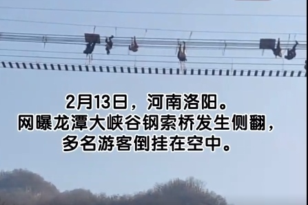 ·洛陽一景區(qū)鋼索橋側(cè)翻多名游客倒掛空中。景區(qū):可能游客自己晃動(dòng)導(dǎo)致,已全部救下。