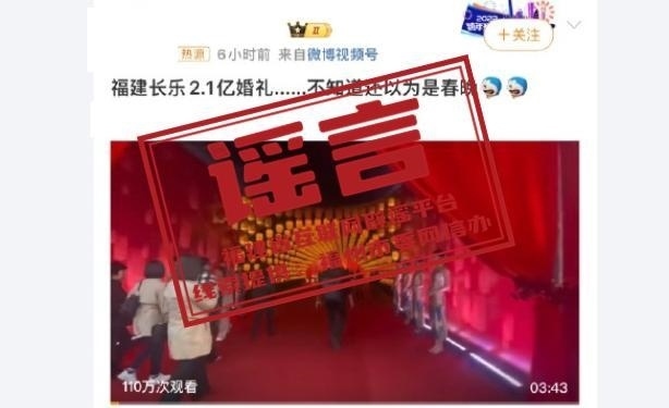 ·福建省互聯(lián)網(wǎng)辟謠平臺(tái):“董事長之子婚宴斥資2.1億”嚴(yán)重失實(shí),相關(guān)賬號(hào)禁言30日。