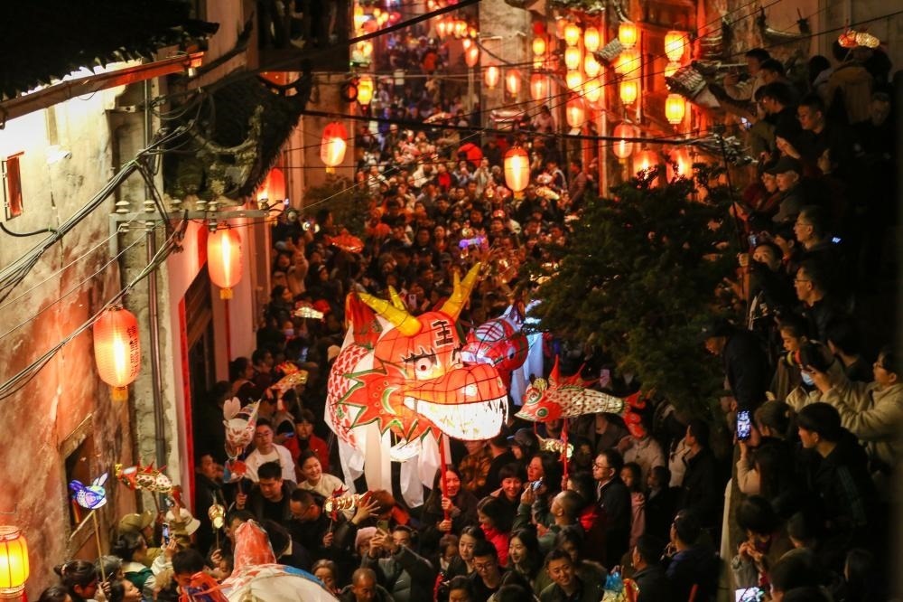 2024年2月13日,安徽黃山,歙縣北岸鎮(zhèn)千年古村瞻淇村熱鬧非凡,一年一度的嬉魚燈民俗活動(dòng)上演。瞻淇村嬉魚燈是一項(xiàng)傳統(tǒng)的民俗活動(dòng),歷史悠久,相傳起源于宋朝,延續(xù)至今已有800多年的歷史。