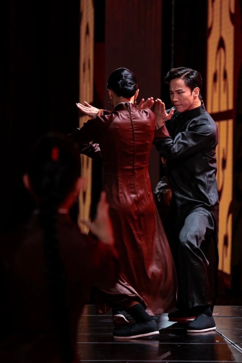密集的鼓點(diǎn)聲中,一道巨大的人像剪影出現(xiàn)在黃褐色的巨幕上,馬步牢固、拳拳帶風(fēng)。目光正隨著人影挪不開眼,只見一個騰空飛旋過后,“葉問”同步從屏后翻旋而出,來到臺前。那人那影,一時(shí)間讓人恍惚,什么叫“形影相隨”,什么叫“弄影團(tuán)風(fēng)”,如今就在眼前!