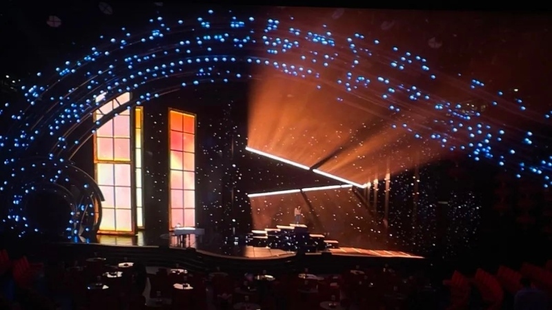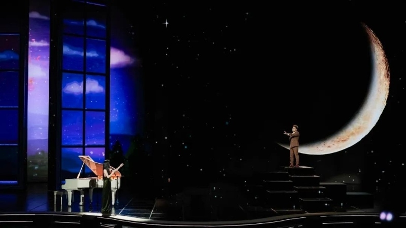 歌詞迅速修改到位,但舞臺的呈現(xiàn)成了讓人反復(fù)琢磨的問題。如何表現(xiàn)“想見卻無法相見”的感覺?如何營造恰到好處的絲絲愁緒?從初次彩排時(shí)用秋千承載思念,到二排時(shí)改用燈光打造“兩個空間”,幾番嘗試總讓人感覺“還差點(diǎn)兒味道”。最后臺長提議,用“剪影”去暈染思念的情緒,可以考慮用蘇軾的“人有悲歡離合,月有陰晴圓缺”的意境,以月亮為背景。這一下子打開了大家的思路。