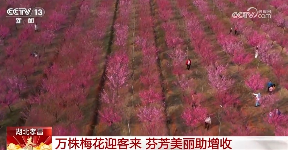 在湖北孝感孝昌縣鄒崗鎮(zhèn),萬株梅花也競相綻放,吸引了眾多市民游客來此“尋梅”。走進(jìn)梅園,一簇簇梅花綴滿枝頭,蜜蜂飛舞其間,市民游客漫步在花海中,拍照記錄美好風(fēng)景。