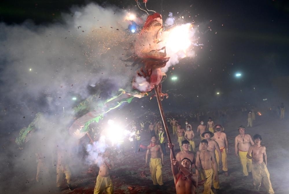 在舞龍人的揮動(dòng)下,一條條長(zhǎng)龍?jiān)跓熿F中上下翻騰,栩栩如生?!芭邶埶街帲骷腋鲬魥A道相迎,將事先準(zhǔn)備好的鞭炮拿出來燃放,祈求新的一年興旺發(fā)達(dá)?!奔易≠e陽縣城的鄒玉特說。