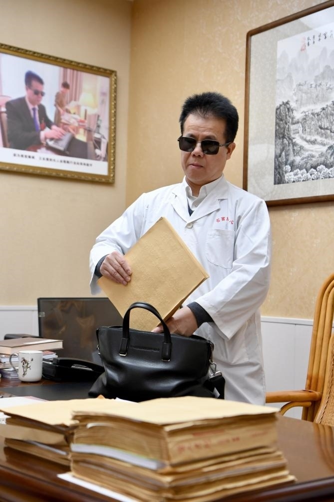王永澄在福州市海峽盲人按摩指導(dǎo)中心的工作室整理盲文建議材料(2月6日攝)。