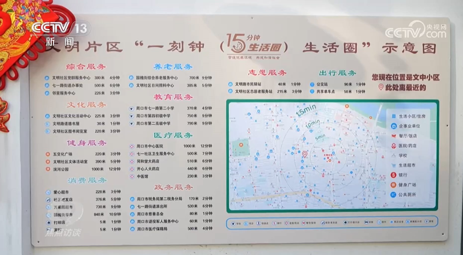 央視網(wǎng)消息(焦點訪談):走出家門,在步行一刻鐘的范圍內(nèi)可以做些什么?河南周口市川匯區(qū)文明片區(qū)的15分鐘生活圈地圖上可以看到百姓基本生活所需幾乎全部覆蓋。河南省周口市是農(nóng)業(yè)大市、人口大市,長期以來,這里城市化水平比較低,城市基礎(chǔ)設(shè)施和公共服務(wù)設(shè)施建設(shè)歷史欠賬多。川匯區(qū)作為城市的老舊小區(qū),遺留問題尤其多。2023年,川匯區(qū)在改造老舊小區(qū)的同時,著力打造15分鐘便民生活圈。經(jīng)過一系列的措施,現(xiàn)在居民的生活怎樣了呢?
