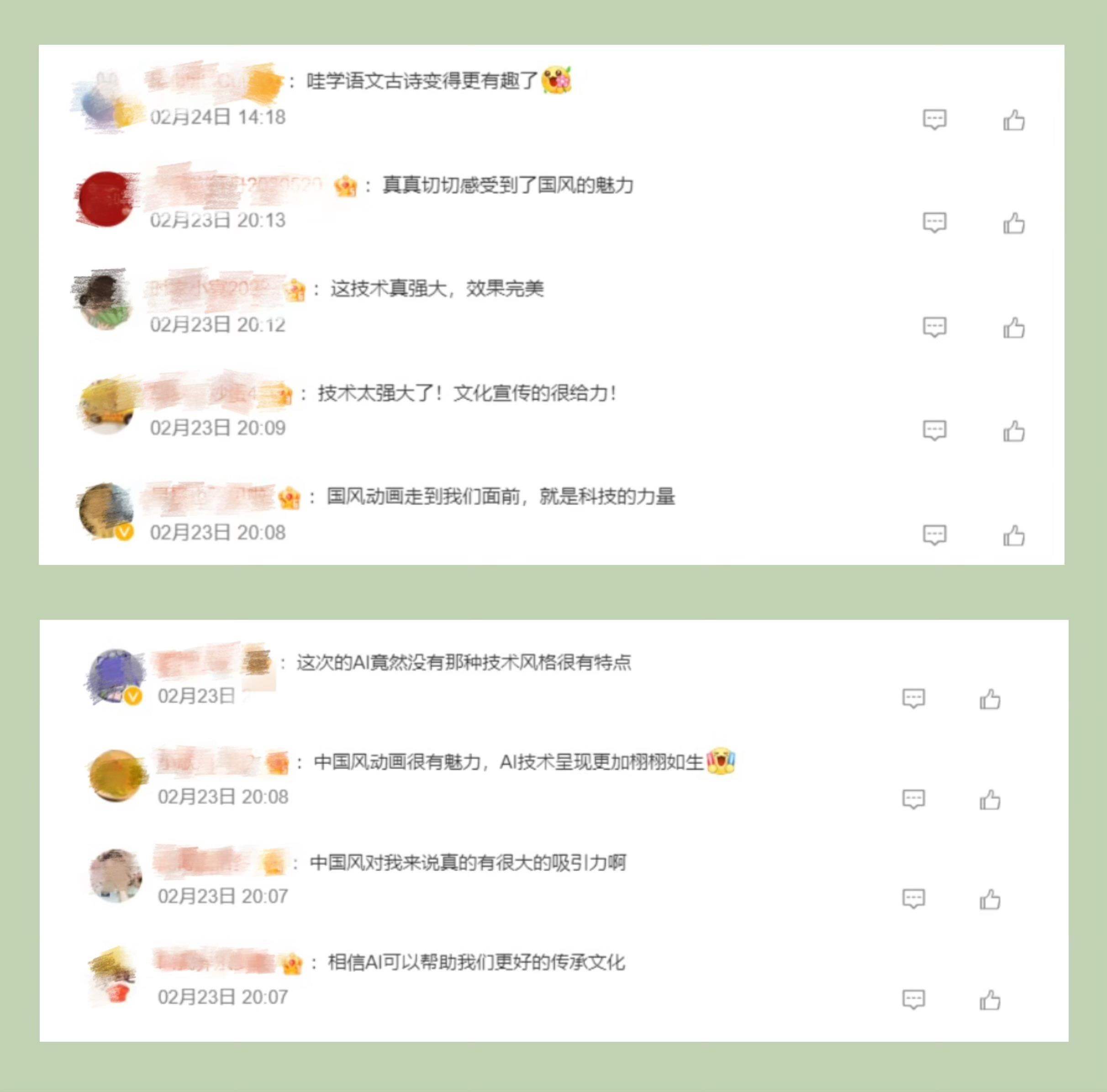 節(jié)目探索詩畫融通的國(guó)風(fēng)動(dòng)畫片新呈現(xiàn),讓廣大青少年進(jìn)一步加深了對(duì)中國(guó)經(jīng)典詩詞的理解和喜愛?!癆I”“總臺(tái)”“千秋詩頌”等成為網(wǎng)友熱議高頻詞。截至2月27日20:00,話題#千秋詩頌#閱讀量超791萬次。網(wǎng)友紛紛留言:“看到這個(gè)系列片,我真的深深感受到了中國(guó)傳統(tǒng)文化的深厚底蘊(yùn)。這些古詩詞深入骨髓,流淌在我們的血液中,是我們國(guó)家的文化符號(hào)”“以AI為媒,央視制作的這部國(guó)風(fēng)動(dòng)畫片傳承了經(jīng)典,喚醒了古韻的新生命”“唯美的畫面讓人動(dòng)容,用視覺的形式了解《別董大》這一首古老的詩歌更別有一番韻味”“這種科技與動(dòng)畫片的結(jié)合,恰好是現(xiàn)在小朋友們和大朋友們所需要的”。