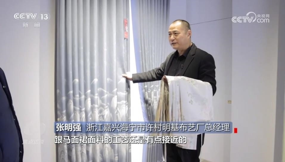 浙江嘉興海寧市許村明基布藝廠總經(jīng)理張明強(qiáng):“提花其實(shí)比較接近,跟馬面裙面料的工藝有點(diǎn)接近,但是馬面裙的密度會(huì)超過它很多?!?/p>