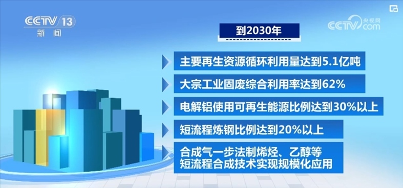 《指導(dǎo)意見》提出,到2030年,主要再生資源循環(huán)利用量達到5.1億噸,大宗工業(yè)固廢綜合利用率達到62%,電解鋁使用可再生能源比例達到30%以上,短流程煉鋼比例達到20%以上,合成氣一步法制烯烴、乙醇等短流程合成技術(shù)實現(xiàn)規(guī)?;瘧?yīng)用。