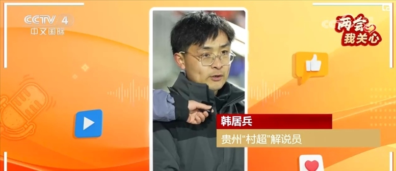 貴州“村超”解說員韓居兵表示他從小接觸到足球,看到前輩們踢球,現在有了“村超”,所以喜歡上了足球。