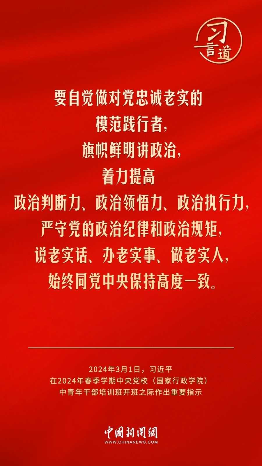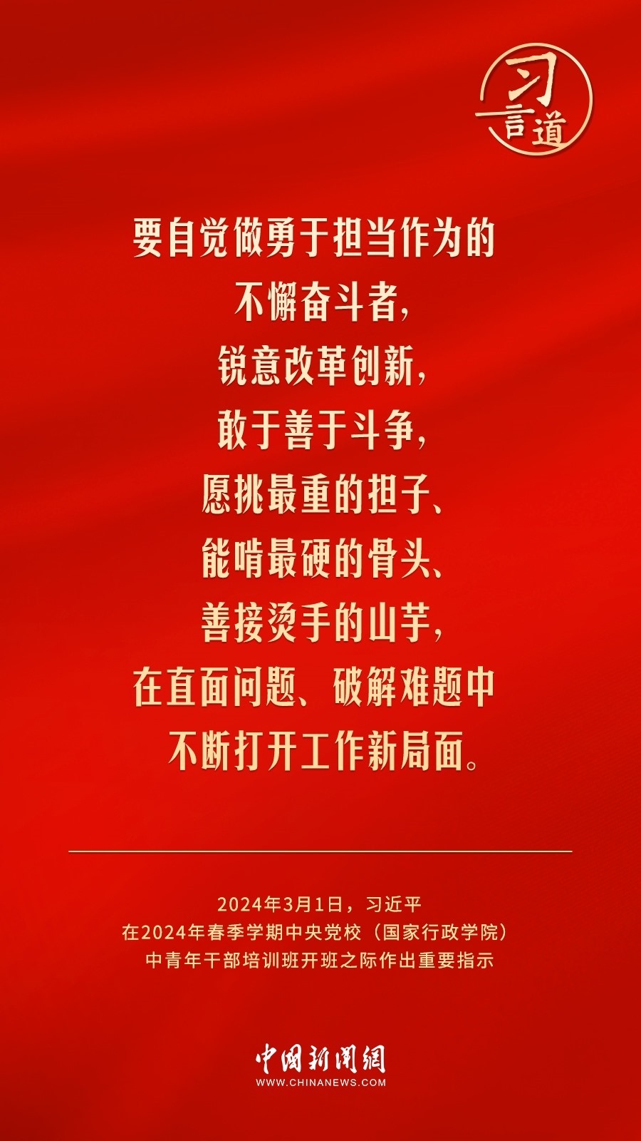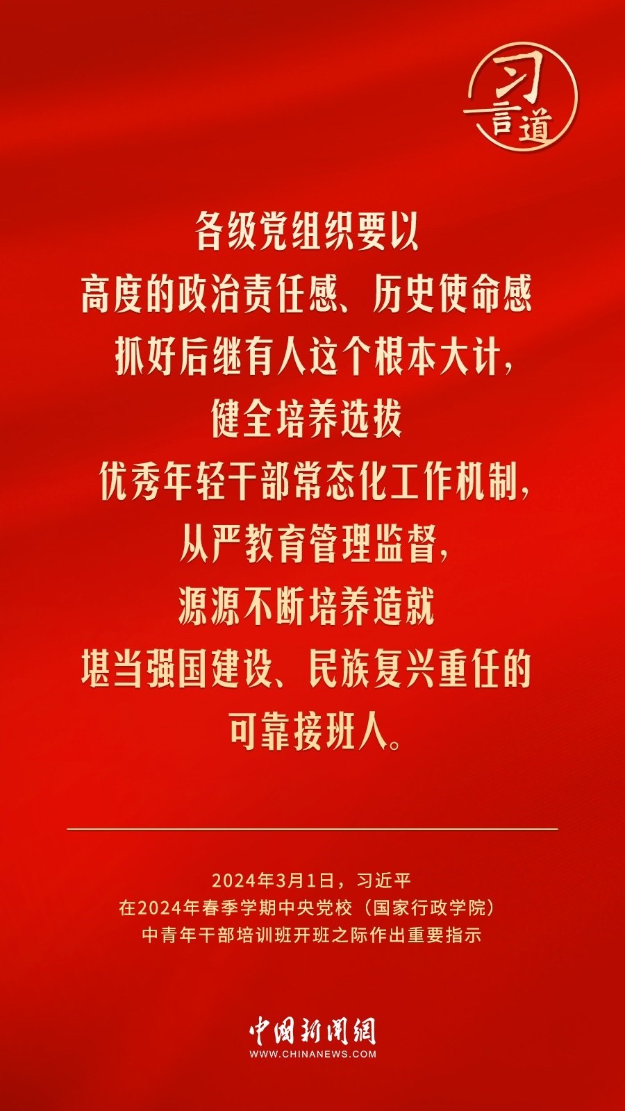 2024年春季學(xué)期中央黨校(國家行政學(xué)院)中青年干部培訓(xùn)班3月1日上午在中央黨校開班。中共中央總書記、國家主席、中央軍委主席習(xí)近平作出重要指示,他強(qiáng)調(diào)——