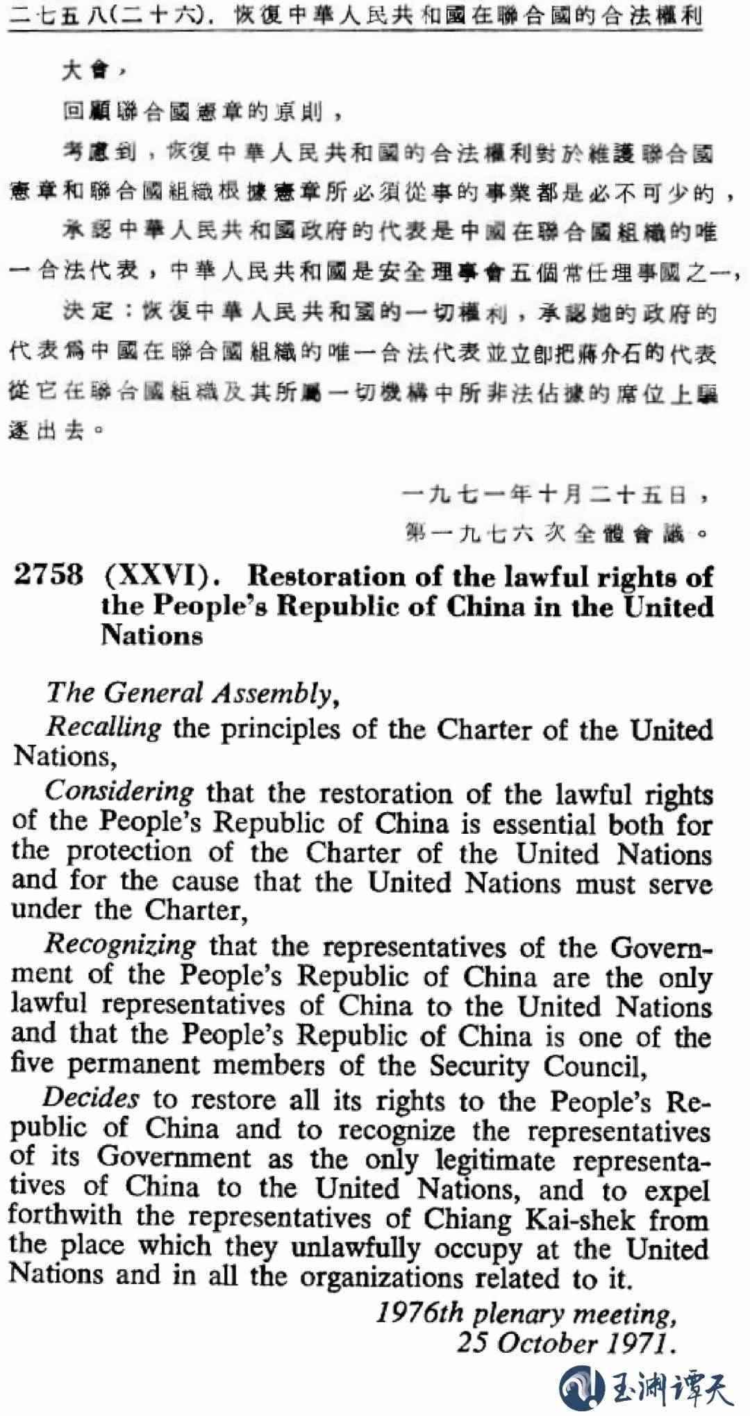同時,聯(lián)大第2758號決議,也解決了臺灣的所謂“國際地位”問題。臺灣除了作為中國的一部分,沒有其他的國際法地位。