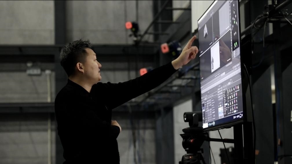 “這是動(dòng)作數(shù)字孿生,利用光學(xué)動(dòng)捕技術(shù),棚內(nèi)多個(gè)專業(yè)攝像頭捕捉演員身上的特定標(biāo)記,以毫秒級的速率計(jì)算出角色的運(yùn)動(dòng)軌跡,然后將數(shù)據(jù)傳送到電腦上,實(shí)現(xiàn)虛擬人物的動(dòng)作?!眹覄?dòng)漫園公共技術(shù)服務(wù)平臺動(dòng)捕棚的技術(shù)顧問崔盛輯向記者介紹道。