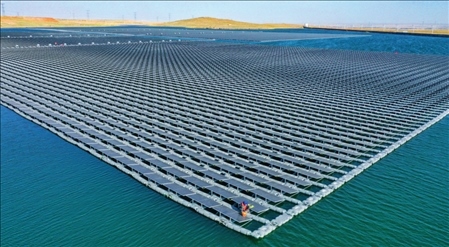 位于寧夏靈武市的國(guó)家能源集團(tuán)寧夏電力公司寧東電廠3×5.98兆瓦漂浮分布式光伏發(fā)電項(xiàng)目(2022年6月17日攝)王鵬攝/本刊