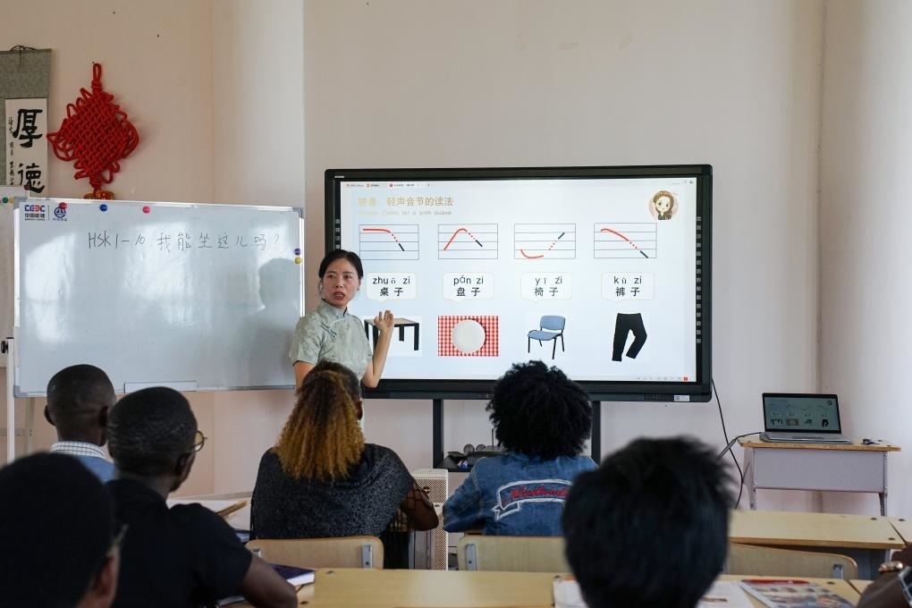 在安哥拉首都羅安達(dá),內(nèi)圖大學(xué)孔子學(xué)院教師正為學(xué)生們講授中文。