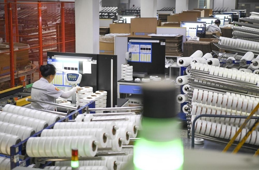 工人在華峰重慶氨綸公司包裝車(chē)間作業(yè)(2023年10月16日攝)。新華社記者 王全超 攝