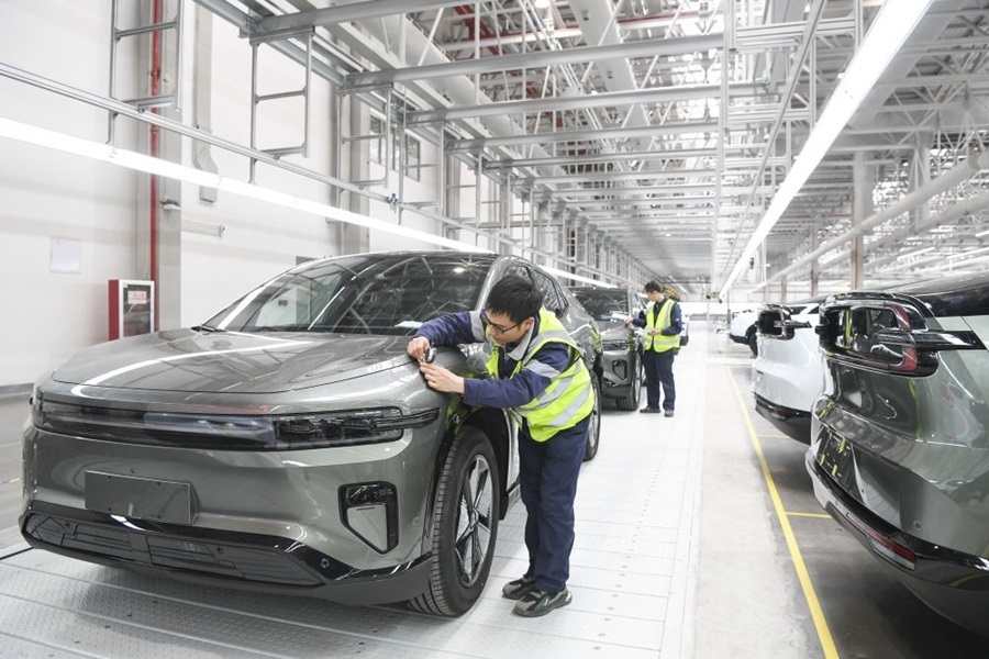 2024年3月14日,工作人員在長(zhǎng)安汽車(chē)重慶渝北新工廠總裝車(chē)間進(jìn)行整車(chē)下線前的檢查。新華社記者 王全超 攝