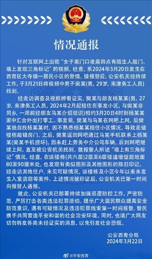 ·天津警方通報(bào)網(wǎng)傳“女子家門(mén)口發(fā)現(xiàn)三角標(biāo)記”。