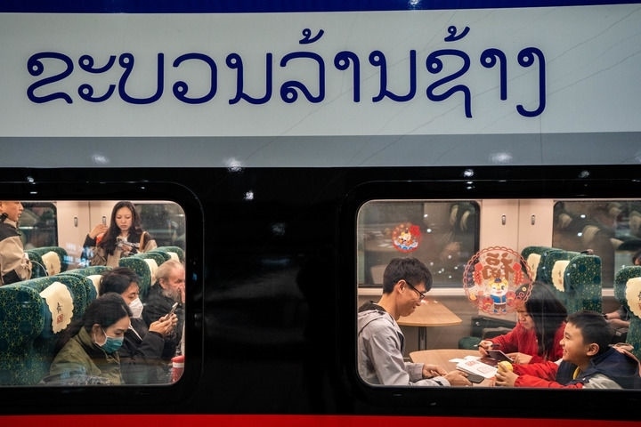 ?游客在昆明南站乘坐中老鐵路國(guó)際旅客列車(chē)準(zhǔn)備前往老撾旅游(2024年2月14日攝)。