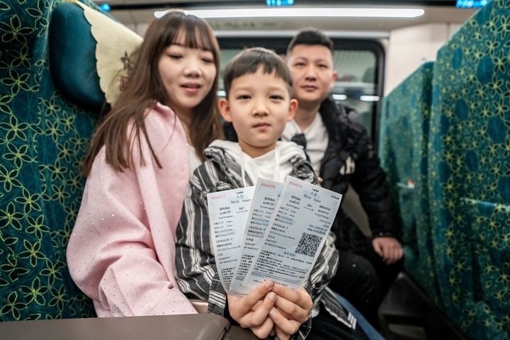 ?在云南昆明,乘坐中老鐵路國(guó)際旅客列車(chē)前往老撾的游客展示購(gòu)買(mǎi)到的車(chē)票(2024年2月14日攝)。