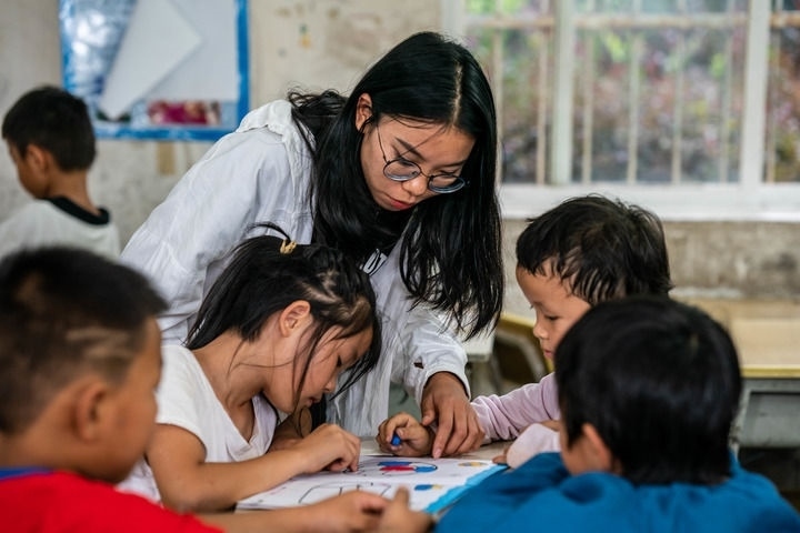 ?在云南省文山州文山市馬塘鎮(zhèn)新開(kāi)田村委會(huì)新開(kāi)田一隊(duì),志愿者楊紅非在“少年兒童之家”教孩子們繪畫(huà)(2022年8月9日攝)。