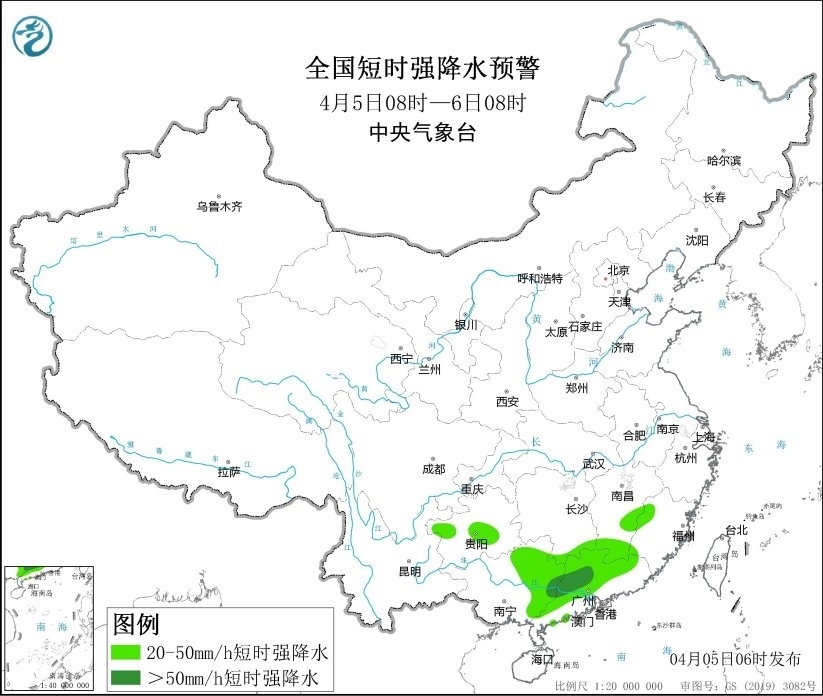央視網(wǎng)消息:中央氣象臺4月5日06時發(fā)布強對流天氣藍色預警。預計4月5日08時至6日08時,江西南部、廣西東部、廣東中西部和北部等地的部分地區(qū)將有8級以上雷暴大風或冰雹天氣;其中,廣西東北部、廣東中西部和北部等地的局地將有10級以上雷暴大風;另外,湖南南部、江西南部、福建西部、貴州西北部和中部、廣西東部、廣東中西部和北部等地的部分地區(qū)將有小時雨量大于20毫米的短時強降水天氣;其中,廣西東部和廣東中西部等地的局地最大小時雨量大于50毫米,個別地方可達80毫米以上。