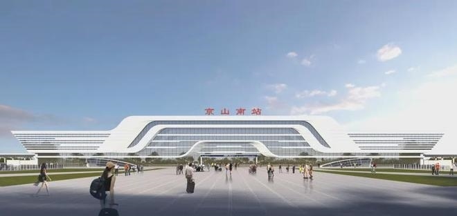 站房設(shè)計(jì)理念以“生態(tài)京山,觀鳥天堂”為主題,立面形成三層流暢的曲線造型,通過層層的推進(jìn),形成飛鳥展開的羽翼,打造舒展柔軟的建筑形象。設(shè)計(jì)提取京山“京”字筆畫,運(yùn)用抽象化建筑語(yǔ)言描摹“京”字之形,形成流暢的建筑形體。目前,車站樁基施工完畢,基礎(chǔ)承臺(tái)建設(shè)完成三分之二。