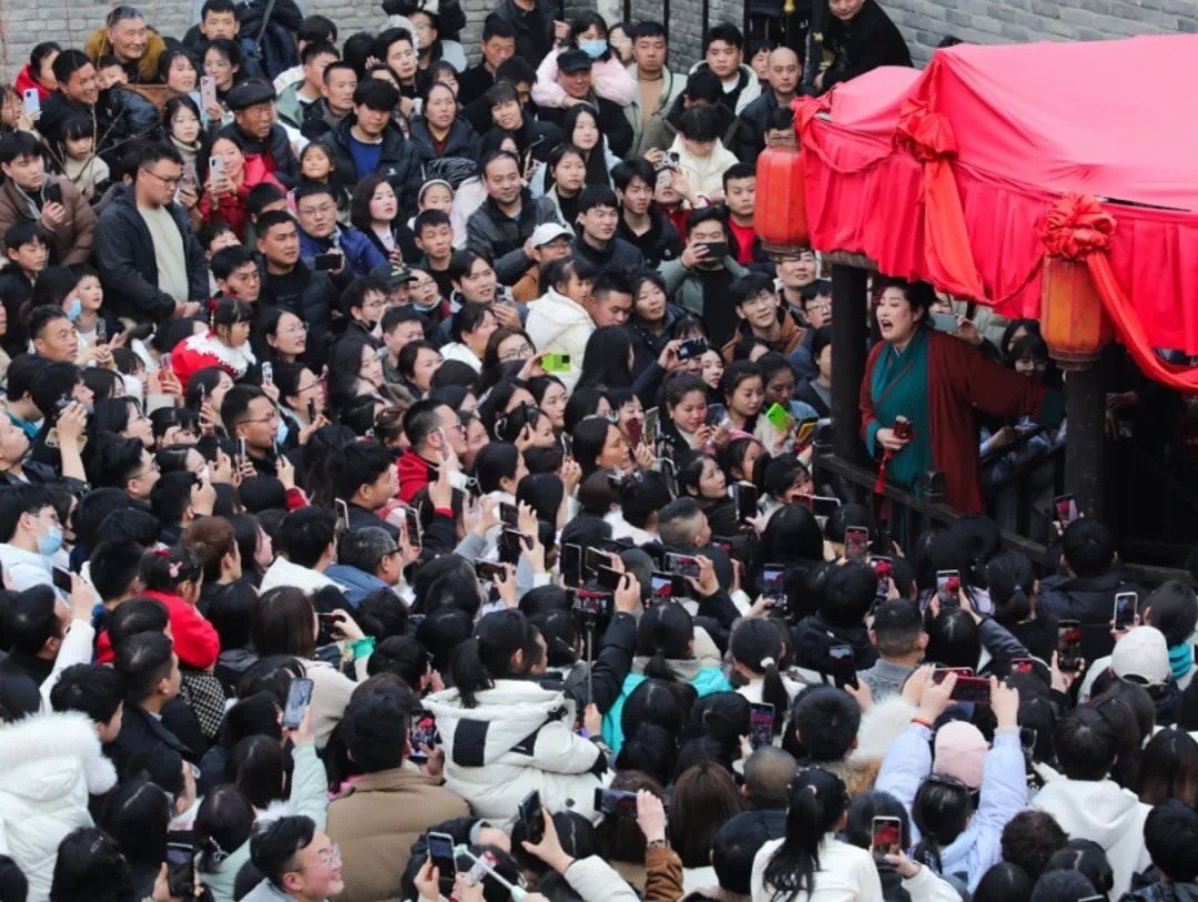 這個春日,午后的萬歲山武俠城景區(qū)水滸街王婆茶館前,熙熙攘攘的人群包圍了舞臺三面,每個能看到臺上的縫隙都被填滿,水泄不通,一旁茶樓二層的好位置已早早被預(yù)訂,有人不遠千里只為一睹真容。