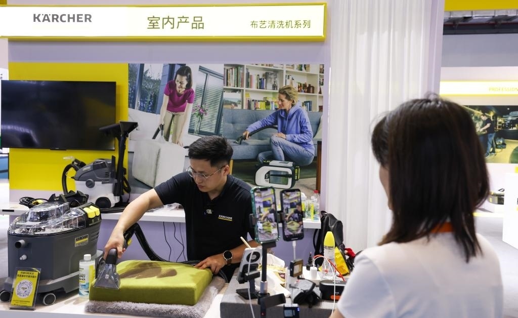 “友友們,現(xiàn)在進(jìn)入‘云’逛消博會(huì)時(shí)間,大家可以通過(guò)直播試擦,感受這款鏡面清潔機(jī)的功能。”一邊在展臺(tái)發(fā)布新品,一邊引導(dǎo)消費(fèi)者進(jìn)入直播間購(gòu)買(mǎi),卡赫現(xiàn)場(chǎng)工作人員陳女士忙得不亦樂(lè)乎。據(jù)她介紹,這是公司第一次在消博會(huì)上使用直播帶貨形式,“效果不錯(cuò),剛剛就有不少粉絲下單”。