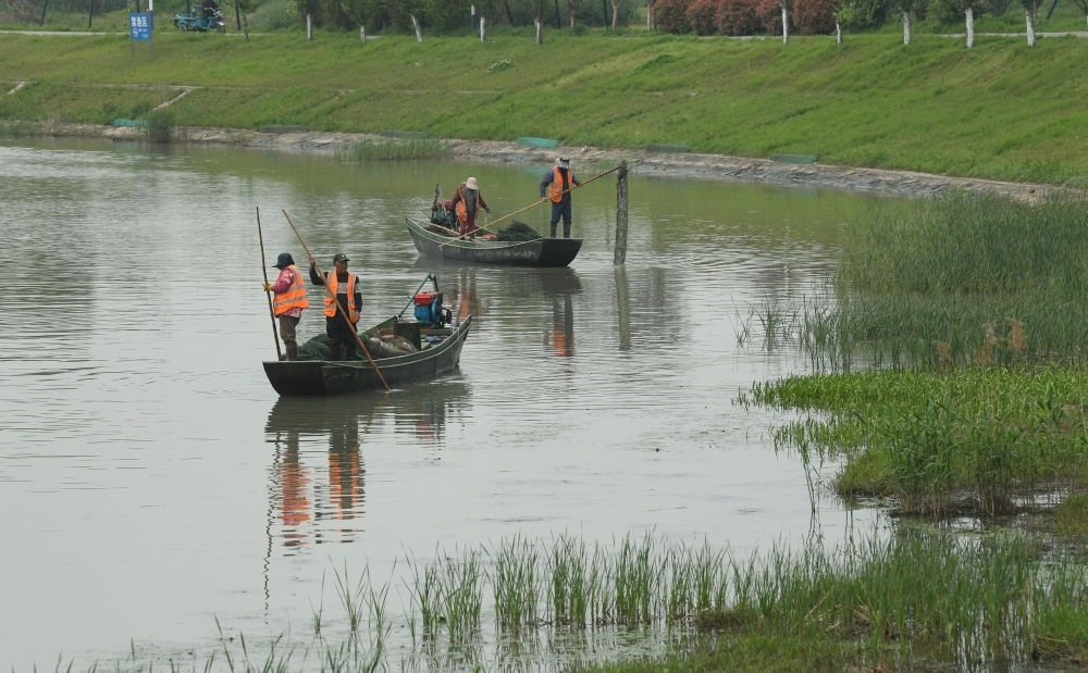 2024年4月11日,在浙江省湖州市吳興區(qū),河道保潔員在太湖沿岸清理非法捕魚地籠網(wǎng)。
