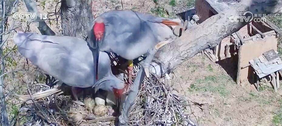陜西銅川野生動(dòng)物保護(hù)管理站的監(jiān)測(cè)畫(huà)面顯示,4月12日,一對(duì)朱鹮夫婦,一只在巢穴中臥巢,另一只則守在一旁不時(shí)整理巢穴。沒(méi)過(guò)多久,臥巢的這只朱鹮站了起來(lái)。仔細(xì)觀察,它身下的四枚卵中有一枚已經(jīng)孵化成功。