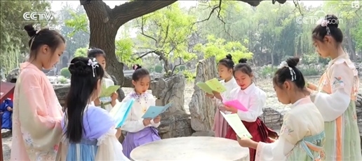 在江西南昌、河北保定,小學(xué)生們踴躍分享讀書(shū)心得。大家還走出教室,來(lái)到林蔭下、池塘邊,沉浸式誦讀經(jīng)典古詩(shī)詞。