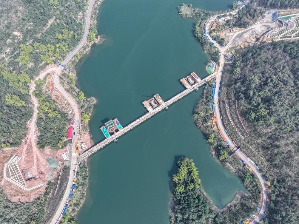 這是2月19日拍攝的位于重慶市銅梁區(qū)的成渝中線高鐵玄天湖大橋建設(shè)現(xiàn)場(無人機照片)。新華社記者 唐奕 攝