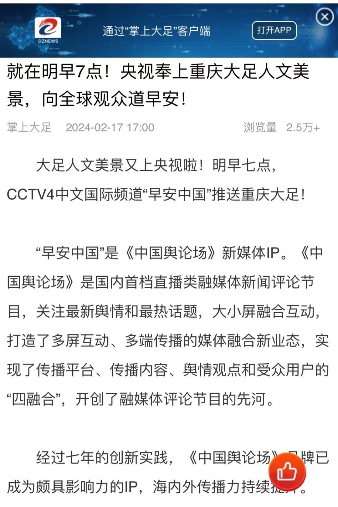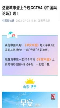 “央視帶你看綠美臺山,這次關(guān)注的是......”“就在明早7點!央視奉上重慶大足人文美景,向全球觀眾道早安!”“央視聚焦!徐州,有美景,有年味”“金葵向陽開,中春好景和風(fēng)裁!美麗江門與您相遇央視《早安中國》”……越來越多的地方政府伸出橄欖枝,希望《早安中國》多“來”當(dāng)?shù)匾挥[好風(fēng)光。