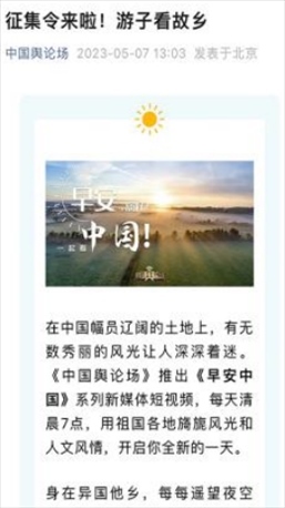每天早7點,新媒體用戶一起床,打開《中國輿論場》,美妙的音樂喚醒耳朵,美麗的風(fēng)景賞心悅目,再加上一句經(jīng)典典故,迎接美美的一天!