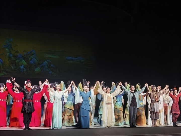 ?2024年4月17日《只此青綠》第500場演出在上海文化廣場上演。圖為主要演員謝幕。新華社記者許曉青 攝
