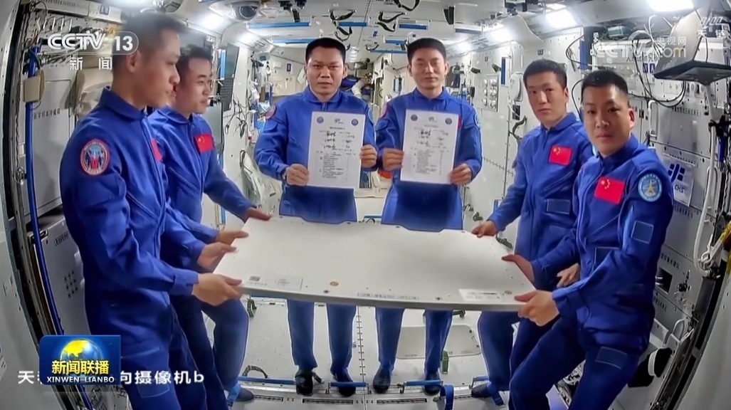 下午三時許,神舟十七號航天員湯洪波、唐勝杰、江新林和神舟十八號航天員葉光富、李聰、李廣蘇在空間站天和核心艙在軌舉行交接儀式,6名航天員分別在確認書上簽字。