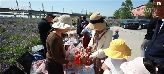 一年前,這里還是一片工地遺留的建筑渣土。當?shù)嘏c科研團隊合作,引進營養(yǎng)土技術(shù),一年內(nèi)就將撂荒地變成了“桃花源”。花海邊還擺起了創(chuàng)意市集,結(jié)合“花”元素的花餑餑、非遺農(nóng)民畫和黑陶工藝品,吸引了不少游客消費。