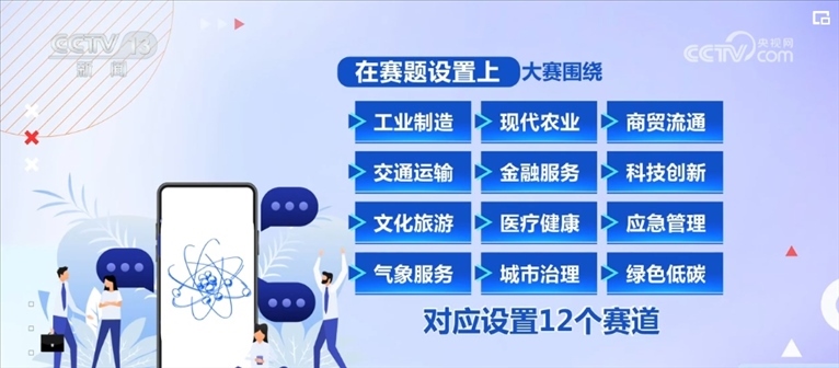 在賽題設(shè)置上,大賽圍繞工業(yè)制造、現(xiàn)代農(nóng)業(yè)、商貿(mào)流通、交通運輸、金融服務(wù)、科技創(chuàng)新、文化旅游、醫(yī)療健康、應(yīng)急管理、氣象服務(wù)、城市治理、綠色低碳12個行業(yè)及領(lǐng)域,對應(yīng)設(shè)置12個賽道。