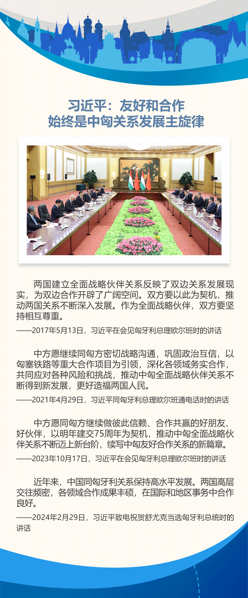 中國與匈牙利的傳統(tǒng)友誼源遠(yuǎn)流長。建交75年來,雙方在國際事務(wù)中相互支持、密切配合。近年來,在兩國領(lǐng)導(dǎo)人的戰(zhàn)略引領(lǐng)下,中匈關(guān)系始終保持高水平發(fā)展。雙方政治互信不斷加深,互利合作成果豐碩,人文交流豐富多彩,在國際和地區(qū)事務(wù)中協(xié)作良好。