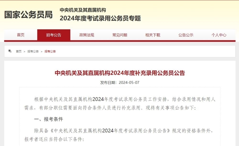 根據(jù)中央機關及其直屬機構2024年度考試錄用公務員工作安排,結合錄用情況和用人需求,有部分職位需要面向符合條件人員進行補充錄用?,F(xiàn)將有關事項公告如下: