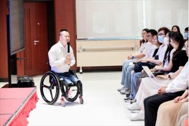 ?下圖為2023年5月,作為四川殘疾人勵(lì)志報(bào)告團(tuán)成員的代國宏走進(jìn)北京大學(xué),與學(xué)生交流。(四川省殘聯(lián)供圖)