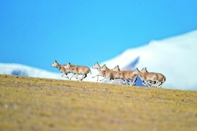 在羌塘國(guó)家級(jí)自然保護(hù)區(qū),一群雌性藏羚羊在奔跑。 新華社發(fā)
