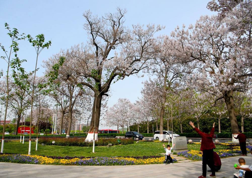 2024年4月16日,人們在焦裕祿干部學院門口的“焦桐”廣場參觀游玩。新華社記者 郝源 攝