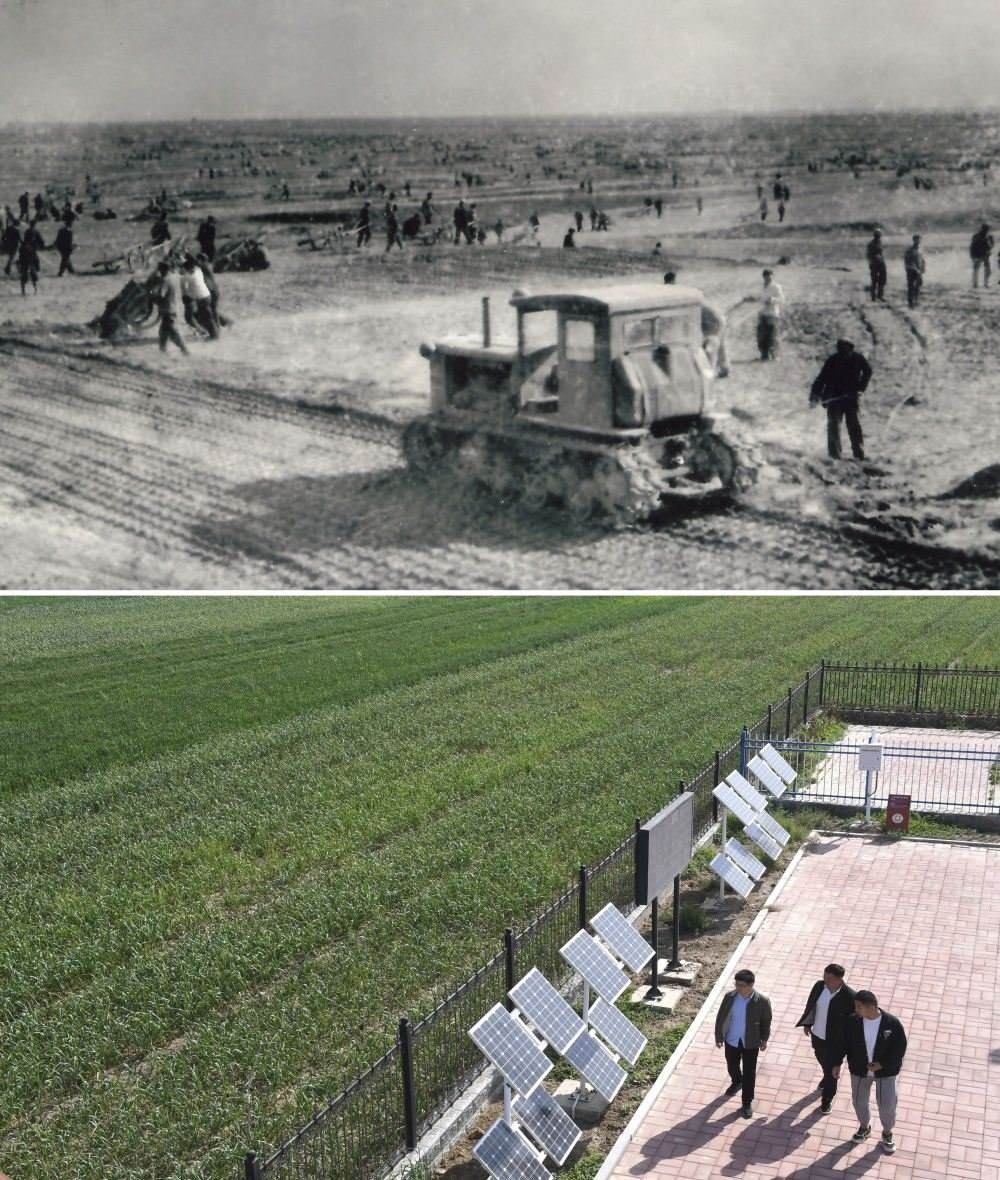 拼版照片:上圖為二十世紀六十年代蘭考改造鹽堿地的情景(資料照片);下圖為2024年4月18日拍攝的蘭考縣紅廟鎮(zhèn)高標準農(nóng)田示范區(qū)(新華社記者朱祥攝)。新華社發(fā)