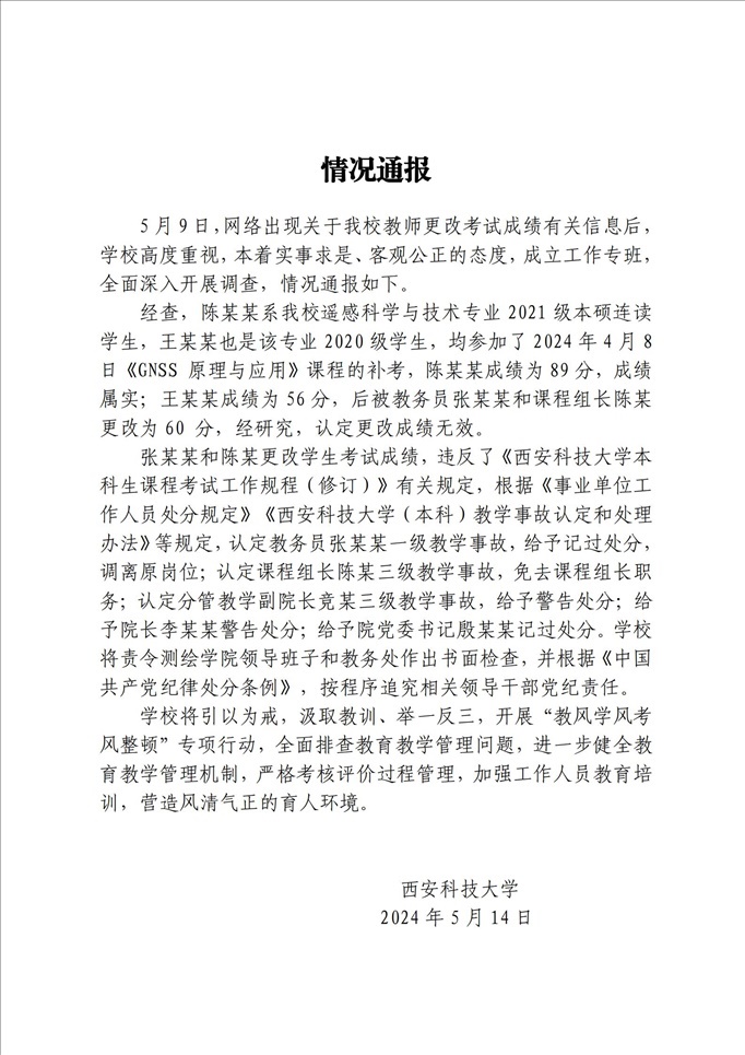 ·學生成績按“鬧”修改?西安科大通報:更改成績無效,多人被處分。