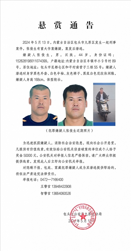 ·內蒙古包頭發(fā)生一起刑事案件,警方懸賞5萬緝兇。