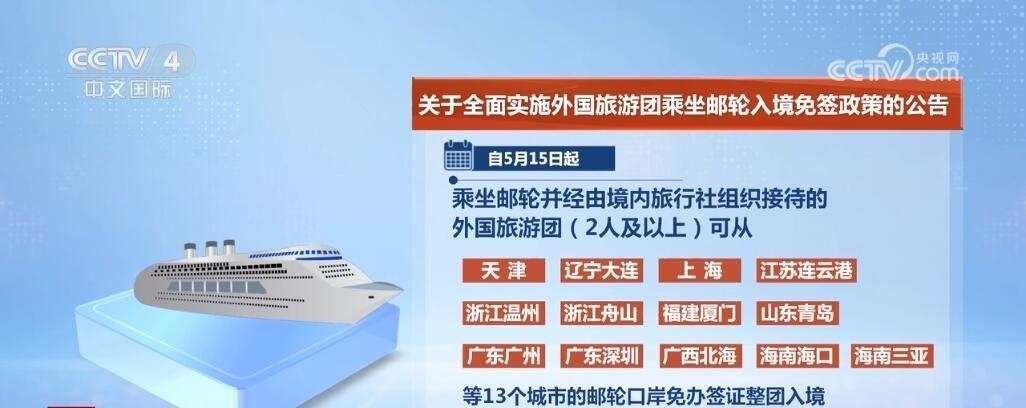 央視網(wǎng)消息:中國(guó)國(guó)家移民管理局發(fā)布公告,為進(jìn)一步促進(jìn)便利外籍人員來(lái)華旅游,自5月15日起,在中國(guó)沿海省份全面實(shí)施外國(guó)旅游團(tuán)乘坐郵輪入境免簽政策,乘坐郵輪來(lái)華并經(jīng)由境內(nèi)旅行社組織接待的外國(guó)旅游團(tuán)可從中國(guó)沿海所有郵輪口岸免辦簽證入境停留15天。